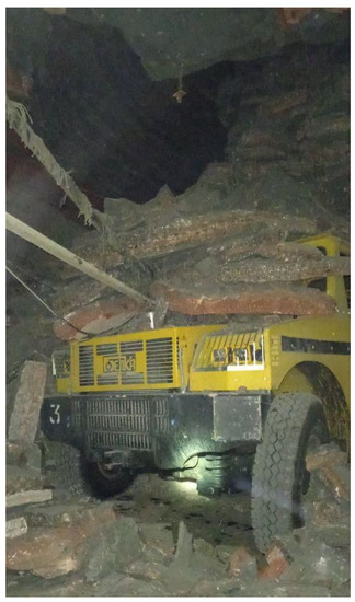 The processes of the displacement of the undermining were accompanied by the Rock foliation along the clay layers and the interlayers. This made it possible to form the gas accumulations in the resulting foliation. Such technogenic gas accumulations in the roof or the floor rocks can be the trap of the rockburst. It is accompanied by the gas release. Thus, a rockburst from the roof onto the car happened in 2021 (Figure 1). The car was intended for personnel. This happened in Mine 3 on the Second potash bed in the camera where the vehicle turns around.