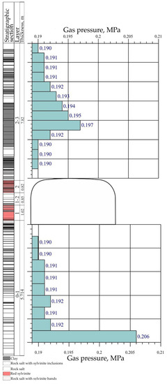 It was found that one of the reasons for the rockburst may be the pressure in the gas accumulations. It is based on the results of studying the place of the rockburst, as well as studying the structure of the roof and the cases of rockburst (Scheme 1). It may be due to the undermining of the Second potash bed by the extraction on the Third potash bed. Because the sharpness deformation state of the salt rock mass was changed, the intensification of the Rock foliation of the roof happened and the free gas was supplied in the resulting foliation. Therefore, the purpose of this work is the study of the underworking effect on the gas content and the gas-dynamic characteristics. A rockburst poses a threat to miners’ lives, breaks driving and wide equipment, and stops the working activity of the mines. Therefore, the study of the underworking effect on the gas content and the gas-dynamic characteristics are relevant problems in mining science. The literature does not show an underworking effect on the gas content and the other gas-dynamic characteristics [1,2,3,4,5,6,7,8,9,10,11,12]. Thus, the underworking effect is the novel aspect of the study.