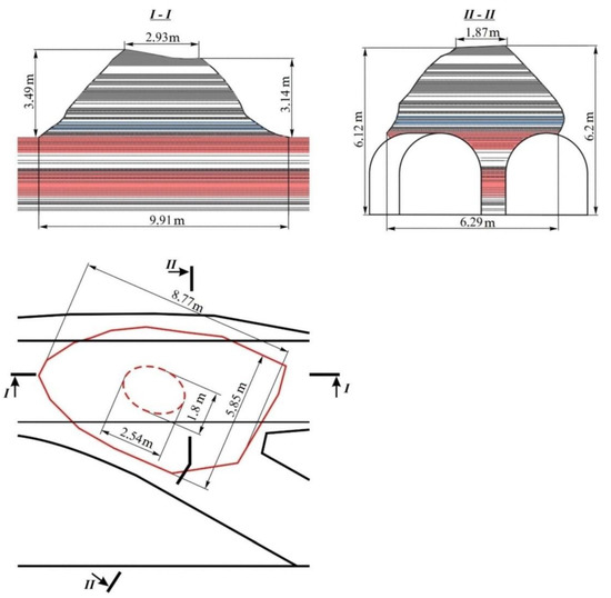 As can be seen from Table 4, a significant change in the gas content of the camera floor installed by the intervals: 2.0–3.0, 3.0–4.0 and 4.0–5.0 m. Apparently, the processes of the displacement and the deformation of the floor rocks during the underworking were accompanied by the Rock foliation of the floor and, accordingly, led to the free gases’ redistribution along the stratigraphic section and to a change in the gas-dynamic characteristics. In this mining situation, two geomechanical processes overlap. The first process is due to the overworking of the camera floor. It was accompanied by the formation of the primary Rock foliation in the floor rocks and the free gas accumulations. The additional (secondary) Rock foliation could form at the floor rocks during the rock underworking, which led to the free gases’ redistribution along the stratigraphic section of the floor rocks. These geomechanical processes and the geological structure of the floor rocks could cause a significant change in the gas content in the indicated measurement intervals.