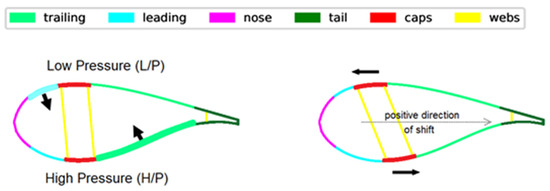 Definition of blade cross-section, demonstrating the material (left) and geometrically (right) based FEC through appropriate asymmetric thickness increase or displacement of the spar caps.