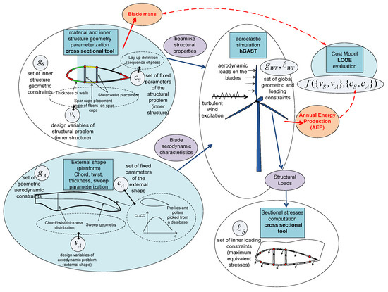 The scalar objective function is the LCoE of the entire turbine that requires as input the material distribution and mass of the turbine components as well as the annual energy production (AEP). The objective function depends on a number of structural design variables, , (e.g., thickness of skin and webs, position and angle of the shear webs, fibre angle, etc.) and aerodynamic design variables, , (e.g., chord, twist, relative thickness and sweep distributions), a set of fixed structural parameters, , (e.g., lay-up sequence on different regions on the section) and aerodynamic parameters, , (e.g., airfoil shapes and lift-drag polars selected from a database).