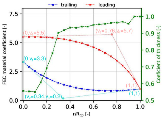 In Figure 5, the optimum values of the six design variables (v1–v6) of CASE A (material FEC) that define the radial distribution of the thickness increase coefficients in the walls of the L/P “leading” and H/P “trailing” elements are presented along with the corresponding Bezier curves. In the same figure, the global thickness variation coefficient of all the walls is also shown. As seen in the figure, a higher increase in the thickness is required for the “leading” element, all along the blade span. At the root of the blade, the thickness increase coefficient is equal to 5.5 for the “leading” element and 3.3 for the “trailing” one. This high increase in the thickness of the two elements is accompanied by a global reduction coefficient for the thickness of all walls of about 0.5. Beyond r/R = 0.3, the global thickness coefficient returns to values slightly lower than 1, while the thickness increase coefficient for the “leading” element still obtains high values (close to 5) that gradually decrease towards the blade tip. The thickness increase coefficient for the “trailing” element, beyond r/R = 0.3, drops to values close to 1. Application of material FEC reduces blade mass by 10.3% and overall LCoE by 0.82%. A marginal increase in AEP of 0.12% is also obtained, which is due to the indirect twisting effect caused by FEC in normal operation. The virtual forward sweeping of the blade due to FEC causes nose-up twisting of the blade sections, which leads to slightly higher power output of the blade.