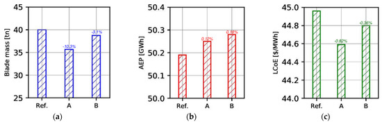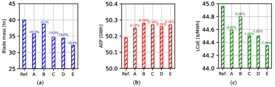 (a) Blade mass, (b) annual energy production and (c) levelized cost of energy of the different designs and relative percentage differences with respect to the reference configuration.