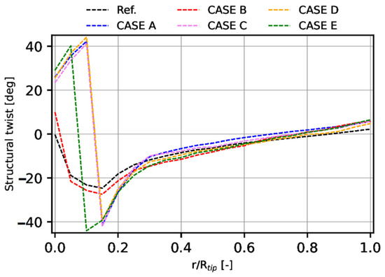 In Figure 8, the structural twist distribution (see definition of structural twist in [10]) of CASES A and B is depicted (along with all other configurations analysed in the next section). It is seen that material FEC gives rise to a high local increase in the structural twist to feather direction (negative twist values) in a radial range of 0.1–0.2. On the other hand, geometric FEC causes an almost constant and much smaller shift in the structural twist all along the span. The positive structural twist angles at the innermost sections (r/R < 0.1) do not affect the stability characteristics of the blade. They are obtained as a result of the redistribution by the optimizer of the material over the root sections in a way that loads are supported. The minor effect of the geometric FEC on the structural twist justifies its limited capability to reduce blade mass and LCoE.