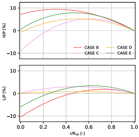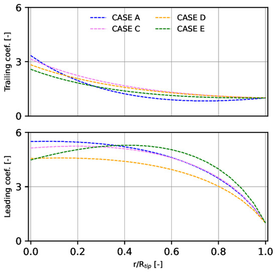 In CASE C, combined application of the two FEC methods (material and geometric) is performed. Figure 9 and Figure 10 provide the radial distributions of the material thickness coefficients and of the caps’ displacement, respectively, for CASE C and all other configurations analysed. It is seen that the combined application of the two methods does not significantly alter the design parameters of the material FEC. On the other hand, the radial distributions of the caps’ displacement appear to be much more sensitive (see Figure 10). This is justified by the observation made in Section 3.2 that the material FEC is far more effective in adjusting the structural twist. Thus, while the predominant design variable that affects structural twist exhibits similar behaviour with that of CASE A, the secondary parameter, which only has an additive effect, is let free by the optimizer to vary a lot more (i.e., the optimum is rather flat). It is interesting to note that, in particular in CASE C, the optimizer finds that the optimum displacement for the H/P cap is towards the LE, while the L/P cap remains almost un-displaced. Although this seems to be a paradox on first reading, it is explained by the fact that moving the H/P cap towards the leading edge leads to an increase in the H/P “trailing” element, leaving more space for material FEC to adjust the cross-bending stiffness. The reduction in the mass achieved by CASE C is 13.3%, which is, more or less, the summation of the reductions achieved in CASES A and B. The reduction in the LCoE in CASE C is 1.02%, slightly lower than the sum of the reductions attained in CASE A and CASE B. Similar to CASES A and B, a very small increase in AEP of 0.16% is obtained.