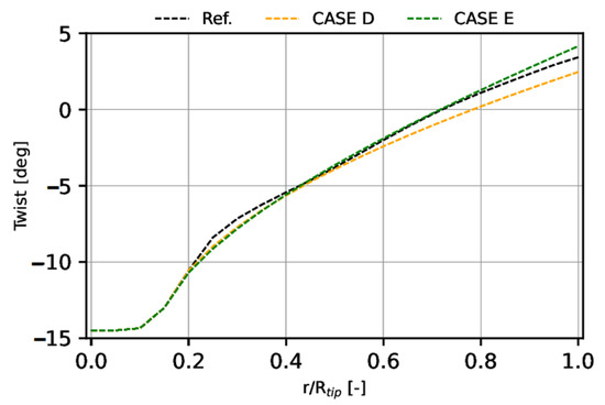 CASE D concerns the combined application of both the above two methods (i.e., CASE C) in conjunction with the redesign of the blade twist. As mentioned in the introduction section, FEC entails an indirect, unfavourable BTC effect, induced by the forward sweep deflection. The above BTC effect causes a nose-up twisting of the blade sections that gives rise to increased flapwise loads. Re-twisting of the blade could be a means to mitigate the above effect. The twist distribution of the blade is parameterized using global Bezier interpolation functions with three CPs. The radial position and the twist of the first CP are fixed at r/R = 0.15 and θtwist = −13.1°. The radial position of the second and the third CP are fixed at r/R = 0.25 and 1, respectively, while the twist angle of these CPs is considered as a design variable.
