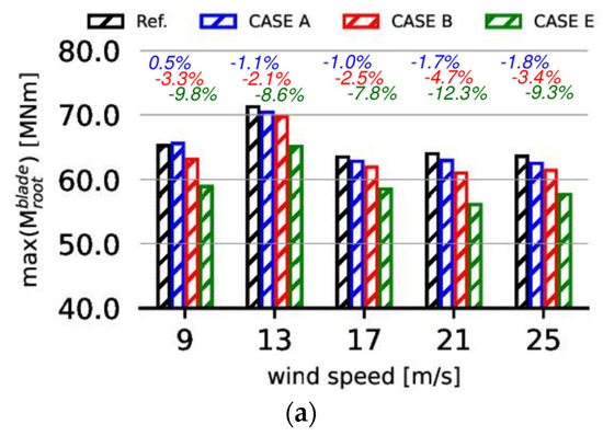 Before assessing the loads in the different designs, a comparison of the natural frequencies of the variants A, B and E with the reference turbine is performed in Table 4, in order to identify possible critical changes in the dynamic characteristics of the new designs. As a result of the increased structural coupling in the flapwise and edgewise directions and the material re-distribution over the cross-sections, the frequencies of the rotor bending modes drop (both the flapwise and edgewise). Higher reductions, in the order of 8–9%, are noted in the frequencies of the asymmetric edgewise modes, in the application of material FEC. The maximum frequency reduction in the flapwise modes is in the order of 3.5–4% and it is, again, obtained for configuration A (material FEC). On the other hand, geometric FEC entails a lower reduction in the natural frequencies. Finally, the reduction in the frequencies noted in CASE E is similar to that in CASE A, most probably dictated by the material FEC. A slight increase is noted in the frequencies of the tower modes as a result of the lower-rotor mass achieved by all tailored designs. The frequency comparisons in Table 4 indicate that the performed structural modifications are not expected to significantly alter the overall dynamic behaviour of the coupled wind turbine system.