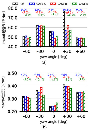 DLC-6.x ultimate loads vs. yaw angle of examined configurations (including safety factors) maximum combined bending moment (a) at the blade root and (b) at the tower base.