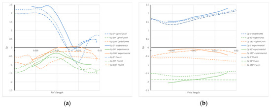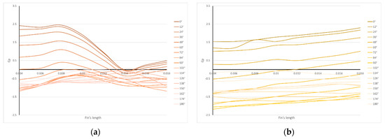 As is well known, the distribution of the pressure coefficient, , on a surface can be used to reconstruct the flow dynamics by the interaction of flow and surface. The pressure coefficient, , distribution on the external and internal face of the inclined fin is shown in Figure 1a,b, respectively, with a Reynold’s number of Re = 56,000.