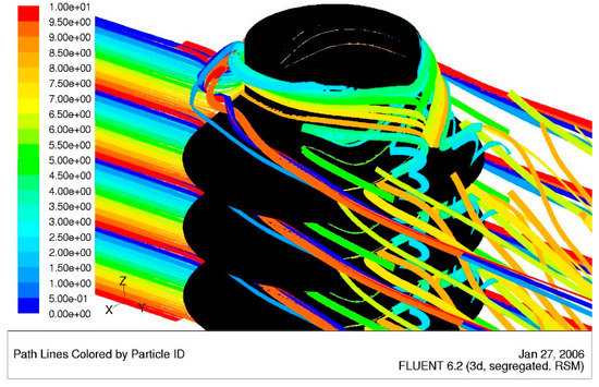 Figure 2 show an isometric view using path lines colored by the particle ID to show the flow characteristics. The finned cylinder walls were colored in black to contrast with the colors of the lines and improve the visibility of the information. The figure used lines to show the results; however, they did not describe the interaction between the fluid and the structure at the edge of the fins and the flow behavior between the fin channels. The lines pass through the finned array at the center of the geometry and then move around the geometry. The flow then forms different magnitude eddies at the back of the finned cylinder at every channel.