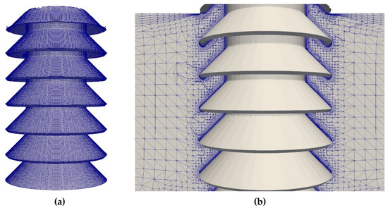 For the meshing technique used in this work, in the first stage, a viscous layer was defined around the finned cylinder shape walls in the software’s hypothesis selection. Ten layers were used, and the total thickness of the layers was 1 mm with a stretch factor of 1. A surface offset and smooth extrusion method was selected to continue with the meshing process around the finned cylinder and therefore to the rectangular volume. After that, the finite volume mesh was converted with the “ideasUnvToFoam” command, and the result was used in the OpenFOAM solver.