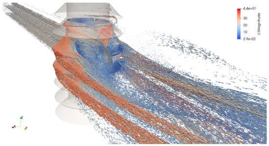 The calculation process completed 20 s. The figures depict the flow behavior at different process times, as well as the development of the flow along the duct. A quasi-stationary flow behavior was established after the initialization of the simulation. Approximately 10 s of process were necessary to observe stable flow conditions in the simulation analysis.