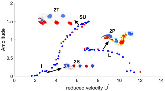 With an increase in the reduced velocity, the system enters in what is known as the super-upper (SU) branch. In the SU branch, the system reaches its higher oscillation amplitudes (up to ). Moreover, this higher amplitude of response has also been associated with the 2T wake mode, i.e., two triplets of vortices per shedding cycle, which maximises the energy transfer between the structure and the fluid [16,17]. The 2T and multi-vortex-shedding modes are also related to the appearance of a third and higher harmonics in the lift force [18]. Finally, the lower branch occurs after the super-upper branch and before the de-synchronisation. Its movement amplitudes are lower than those of the SU branch and it has a 2P wake mode, i.e., two pairs of counter-rotating vortices per cycle.