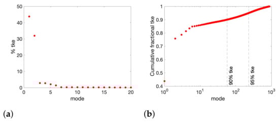 Figure 6a shows the percentage of the turbulent kinetic energy () captured by each of the POD modes and Figure 6b shows the cumulative energy for all the modes. The POD method ranks the modes according to their energy content in descending order. Notice that in the figure, only the first 20 modes are plotted. As higher modes are expected to have lower and a more disorganised structure, these modes contribute little to the present discussion and are not plotted. The two highest energy containing modes account for roughly 44% and 32% of the flow . These two modes contain the main coherent structures of the wake, i.e., the span-wise vortex tubes. However, for high-order modes, the energy is dispersed. In fact, as can be seen from Figure 6b, 57 modes are required to capture of the and more than 230 to capture the 95%. This is in contrast with POD analysis performed on the static cylinder, where most of the energy is captured by a few modes. For instance, Ma et al. [23] at found that most of the energy is captured by the first 20 modes. The poorer energy convergence observed here can be attributed to a re-distribution of the turbulent kinetic energy to high-order modes due to the cylinder oscillation. Considering that in the present work, there is a combination of in-line and cross-stream oscillation of the cylinder, a larger energy spread is expected. Although, a-priori, this poor energy convergence might render the construction of a reduced-order model containing 95% of the energy impossible, it is still useful in order to study the main energy containing modes and to separate the largest scales of the flow to study their dynamics.