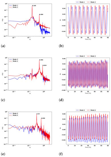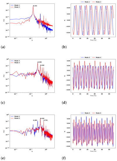 Modes 5 and 6 of the stream-wise and cross-stream velocities (see from Figure 12i–l) are the first that include the formation of the 2T wake structure. The appearance of the 2T can be directly read from the stream-wise correlations as they have several extreme changes next to the cylinder, which imply the presence of the vortex rotating in different senses. Figure 13e shows the spectra for both modes. The most energetic peak in the spectra is located at , which is actually the third harmonic of the vortex-shedding frequency. In addition to this peak, a peak at the fifth harmonic of the vortex-shedding frequency is observed, i.e., at and mode 5 also has a secondary peak at . This is the frequency of the in-line oscillation of the cylinder.
