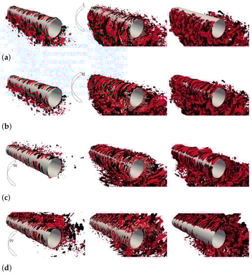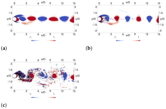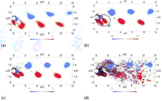The reconstruction of the flow in the wake with 2, 6, 10 and all the modes is shown in Figure 16, where contours of the span-wise vorticity are depicted. Even though the formation of the large-scale vortexes can already be seen with two modes, it is after the inclusion of the first six modes that the formation of the 2T pattern can be observed. This structure, marked in Figure 16b, can be seen as two counter-clockwise-rotating vortexes and one clockwise-rotating vortex close to the cylinder. Moreover, for capturing the formation and dissipation of the Taylor–Görtler structures, at least 10 modes are required, as can also be seen in Figure 17. In the figure, the formation of these structures at different points of the cycle is represented by stream-wise vorticity contours.
