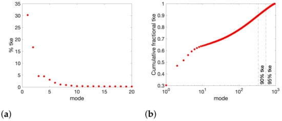 Super-upper branch . (a) Energy of the first 20 POD modes expressed as a percentage of the turbulent kinetic energy () and (b) cumulative energy.