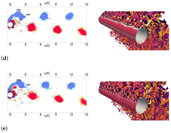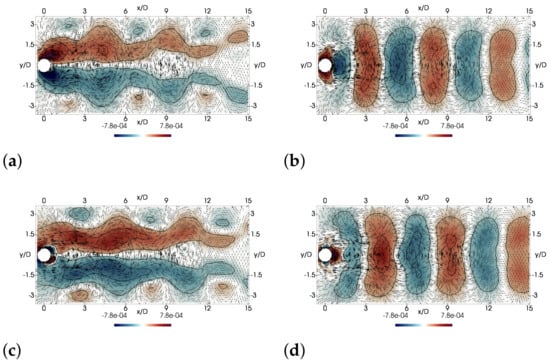 Associated with these modes is the frequency of the in-line oscillation of the cylinder, i.e., , which can also be interpreted as an harmonic of the vortex-shedding frequency. This frequency can be identified as a strong peak in the spectra of the coefficients of modes 3 and 4 (see Figure 13c). Similarly to the first couple of modes, there are secondary peaks in the spectra; mode 4 has an additional peak at the third harmonic of the vortex-shedding frequency, . Indeed, the vortex-shedding process in this branch is more complex as it implies the formation of the 2T structure and the Taylor–Görtler structures [20]. As will be discussed below, the formations of both structures are related but occur at different instants of the cycle; this leaves a different footprint in the harmonics observed in this couple of modes. In fact, these modes are the first to contain information on the Taylor–Görtler structures. This information can be found in the span-wise velocity component correlations. Figure 15 shows the third and fourth modes of the velocity along the span-wise direction. If these modes are examined, one can see the information related to three-dimensional structures and specifically those of the Taylor–Görtler structures. However, it has to be pointed out that similar correlations are also seen in other less energetic modes, which means that to complete the formation and dissipation of these structures, the inclusion of more modes is necessary.