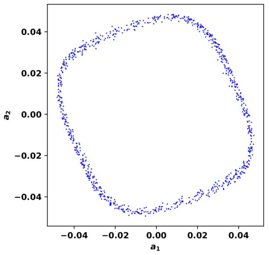 The first six spatial modes of the stream-wise and cross-stream velocity fluctuations are presented in Figure 7. They are plotted at the mid-span of the periodic direction z. As the vortex shedding is a periodic phenomenon, it is expected to obtain a pair of highly correlated modes (i.e., 1–2, 3–4, …) with a phase shift of between each other. This phase shift can be readily seen if the distances between the centres of the same correlated areas are measured. In fact, if the lissajous of the time coefficients for these modes is plotted (see Figure 8), one can see the circular representation of the pair of coefficients; this suggests a cyclic variation between them. This distribution is expected as large-scale vortexes are formed with a periodic pattern and convected downstream forming the 2S wake pattern.