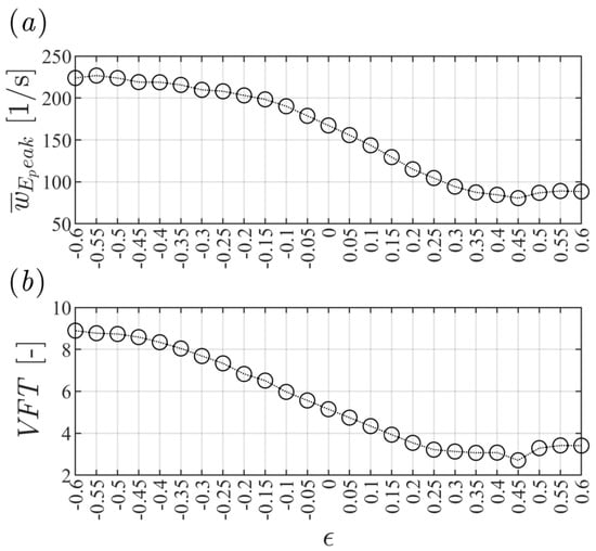 This point is supported by the result shown in Figure 3a reporting the values that are higher for and decrease as the curve transits towards . This is also confirmed by the VFT values in Figure 3b. These results indicate how effectively an MV with actually affects the ability of the LV to redirect flow to the systolic outlet. In fact, the VFT reaches more physical values when it approaches the direction of positive asymmetry, showing how good ventricular functionality corresponds to the correct distribution of the flow. Taking into account the values published in a previous work [] and the existing literature [,,,], we identify an optimal range between = 0.15 and 0.6, considering that after = 0.4, fairly stationary values are found.