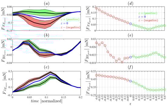Graphical representation of HDF E-wave curve for different valve asymmetry of (a) Fx, (b) Fy and (c) Fz projections. Green color represent the of , blue line = 0, red color the of and black line the mean value for and , respectively. Graphical representation of the HDF peak for different valve asymmetries of (d) , (e) and (f) projections. Green represents , blue represents , and red represents .