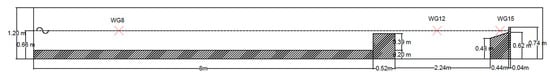The two-dimensional numerical wave tank is adopted from Jin [42], and is 16 m long, 1.5 m wide, and 1.2 m high, as shown in Figure 4. For computation efficiency, the channel length of the physical experiment is shortened. The wave generates at a distance of two wavelengths (8 m) away from the first dike element. This distance enables the wave maker to generate stable waves before waves reach the operation zone where the dike elements are located. The slope that levels up the channel bottom by 0.2 m in the physical experiment is ignored in the numerical simulation. The channel bottom is at 0.2 m from the beginning of the numerical wave tank to simulate the last 8 m of the physical water channel. Therefore all structural elements are relocated to new positions in the simulation. The specific values of each element are shown in the Table 3. The wave gauges locations are shown in the Table 4.