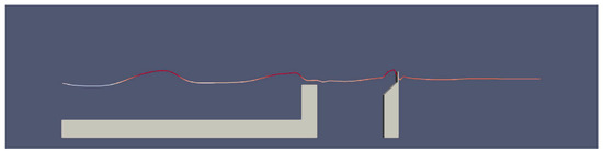 The second-order Stokes wave theory is applied as the wave generation method. The designed wave height is 0.22 m, and the wave period is 2 s. At the initial condition, the water depth is 0.66 m over the whole wave tank domain. In order to limit effects by secondary reflection and transmitted waves from structure elements, wave generation and absorption methods are set as the relaxation method. A wave-generation zone of 4 m is set at the inlet of wave tank, and a wave dissipation zone of 4 m is set at the outlet of the wave tank. The main structural elements for dike system are located in the operation zone of numerical wave tank from 4 m to 12 m. The Courant–Friedrichs–Lewy number in this model is 0.3, set as same as applied in Mokos’ physical experiment [33]. The total simulation time is 40 s. The first 15 s allows the wave to propagate to the dike structure. Within the next 5 s, the waves propagate over the complex structure and deform for the first time. In the remaining time, the system is gradually stable for data record and analysis.