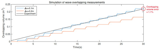 The data in the physical experiment does not include the time evolution of overtopping, but only the final overtopping value and total time. Therefore, it is assumed that the overtopping volume in the physical experiment increases linearly. Figure 10 shows the evolution of overtopping volume at two different resolutions. The simulation data result with a grid size of 0.2 m is lower than the experiment. At a coarser resolution, the wave surface fluctuates greatly, so the simulation results should be quite different from the experimental results, which is also in line with our expectations.