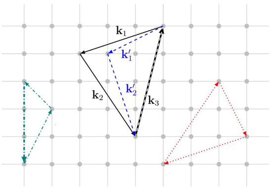 Color online. Triads on an integer lattice. Each mode has an integer length in both directions, . Each triad satisfies and therefore forms a triangle (the location of the triangle on this grid has no significance). The triads shown represent a resonant triad (black, solid) and a quasi-resonant triad (blue, dashed) in its one-vicinity (also called a near-resonance); a general detuned triad (red, dashed); and a zonal triad (teal, dot-dashed), which is a (detuned) triad that includes a zonal mode (has and is therefore vertical).