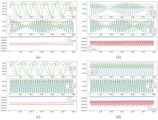 The form of the coupling coefficients in the dynamical equations for three resonantly interacting spherical Rossby waves are of the form , where is a property of the triad and the indices are a permutation of 1,2,3. Here, for illustrative purposes, we allow ourselves to vary for the resonant triad and for the detuned triad, keeping the initial conditions fixed. As a period of energy exchange within a triad depends on the initial energy distribution within the triad and on the coefficient , this allows us to vary the relative time scales in dynamics. Figure 6 depicts characteristic dynamics of the modes’ energies in four different cases: uncoupled resonant and detuned triads (physical detuning), panel (a); coupled triads (physical detuning), panel (b); uncoupled triads (artificial zero detuning), panel (c); coupled triads (artificial zero detuning), panel (d). The resonant triad has , and the detuned triad has . This allows us to adjust the relative time scales in the uncoupled dynamics with zero detuning, as seen in the top and middle rows of Figure 6c. The slowest oscillation time scale, seen in the middle row of Figure 6a, is given by the detuning period . It is evident in the top row of Figure 6b that both the fast and the slow dynamics of the detuned resonance are communicated to the exact resonance when coupled.