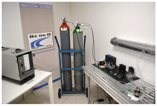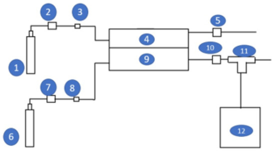 A customized test bench was designed by BeonD for the hydrogen permeability test. In Figure 1 and Table 1, a diagram of the test bench and its legend is reported. A nitro hydrogen mixture (95% N, 5% H2) was selected as a test gas instead of a dry air mixture to ensure a sufficient concentration of hydrogen for safety purposes since, at concentrations higher than 4% in the air, hydrogen can become explosive.