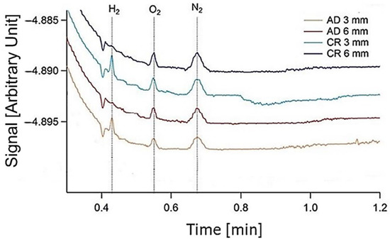 In Figure 6, a chromatogram of the permeability test results is reported. The graph has been offset by a fixed amount to allow the best visualization and reading, as is usually the case in chromatographic studies. The parameter to be taken into consideration when reading the graph is the area subtended value of the peak with respect to the baseline of its curve. The time indicated on the X-axis starts from the instant in which the gaseous species enter the column of the gas chromatograph. The release time of the molecules of the chromatographic column depends on the properties of the column itself and is always the same for the same chemical species. For 6 mm thick sealants, there is no significant peak in correspondence with hydrogen. The peaks of oxygen and nitrogen recorded are attributed to a small permeation of air through the PA6 plastic pipes of the system, negligible for the purposes of the test since it is not able to vary the quantity of hydrogen permeation. For 3 mm thick sealants, significant H2 peaks for both sealants were registered. The Cristalcar hydrogen peak is greater than the Advantseal hydrogen peak, in accordance with the permeability values indicated in Table 2. The hydrogen sensors constantly monitored the amount of ambient hydrogen, which was always not significant. Therefore, it can be said that:
