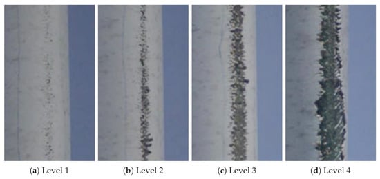 In this work we report just one of the many real examples of LEE. In particular, Figure 1 depicts the potential damage caused by LEE on a wind turbine blade by showing four levels of erosion damage. According to Sareen et al. [31], LEE starts with the formation of small pits near the blade leading edge. As the density of these pits grows over time, they join together to form larger and deeper gouges. The final stage of the erosion process is delamination, which begins at the leading edge and grows in chordwise extent over time. The result of this process poses a complex geometrical configuration of the leading edge, and a three-dimensional flow behavior over the airfoil is expected.