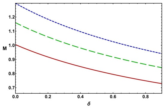 The variation in phase velocity (M) of NAWs in magneto-rotating cold degenerate plasma () for non-relativistic electron or (blue dotted curve), ultra-relativistic electron or (green dashed curve), relativistic electron or (red solid curve), where , , , , and .