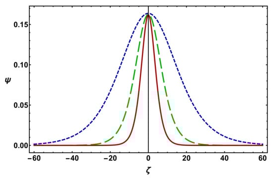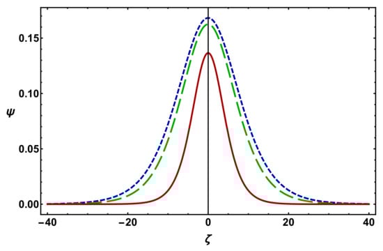 Figure 4. The effect of temperature on NA wave potential in degenerate ultra-relativistic plasmas by considering (blue dotted curve), (green dashed curve), and (red solid curve) when , , , , , and . - The rotational frequency of the plasma system does not affect the amplitude of the NASWs. However, the width of the NA wave potential decreases with an increasing rotational speed of the plasma system as shown in Figure 5.