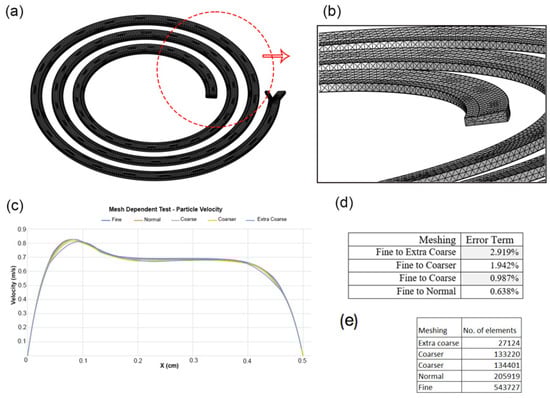 (a) Top view of the meshed spiral geometry. (b) Zoomed-in view of the tetrahedral elements. (c) Mesh-dependent test based on the velocity (m/s) at a line located just before the outlet. (d) Mesh errors in comparison to the fine mesh. (e) Number of tetrahedral elements in the mesh-dependent analysis against meshing type.