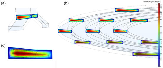 A number of parameters were studied and optimized to reach final separation. The parameters crucial for data analysis include the capture rate, Reynolds number, aspect ratio, and geometric design manipulability [24,25]. The capture rate refers to the percentage of particles captured at each outlet, which evaluates the effectiveness of the outlet system model and ensures efficient functionality. The Reynolds number analysis is related to the fluid’s volume flow rate and velocity at the inlet, which affects the particle behavior in the microchannel. The aspect ratio is the ratio between the height (h) and the width (w) of the channel, which is pre-defined in the design geometry.
