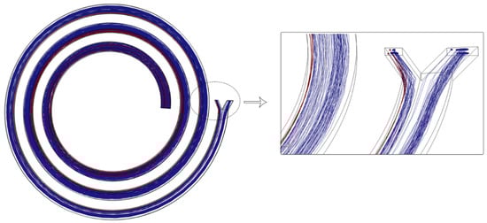 Figure 4a displays the spiral with red-colored WBCs of a 12 µm diameter and blue-colored RBCs of a 6 µm diameter. The results show that for the designed geometry with the specific cross-sectional values, the three turns were sufficient for successful particle separation (Figure 4b). The particle trajectory was formulated based on the Dean vortex and the effect of drag and lift forces. The Dean vortices and the accompanied forces shifted the larger WBC particles towards the inner wall curve until they attained equilibrium between the FL and FD forces and exited from the rectangular outlet. However, the smaller particles with an unequal FL and FD migrated to the outer wall of the microchannel. Similarly, the effect of the secondary flow on the RBCs and WBCs particle separation has been demonstrated in other experimental and numerical studies [14,34], where the different sized particles obtain different final equilibrium positions. For this study, from the initially released 100 RBCs, 99 successfully separated from the WBCs at the outlets, with only one RBC exiting with the 20 WBCs (Figure 4c).