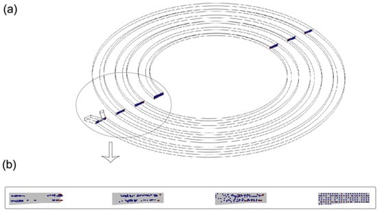 (a) Seven vertically-cut planes in the 150 µm height spiral. (b) Zoomed-in view on the left side of the microchannel showing scattered particles at each spiral turn.