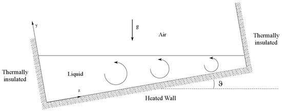 In all these instances, mixed buoyancy-Marangoni convection can be produced by gradients of temperature (Lappa [11]), gradients of concentration (Zhang et al. [12]) or both effects (Boura and Gebhart [13], Qin and Grigoriev [14]). In the present study, we concentrate on the situation where convection is produced by thermal effects only. In particular, the reader is referred to Figure 1 for the required details about the configuration used here to ‘mimic’ situations such as those occurring in the abovementioned technological applications. The greater proximity of the free surface to the heated bottom in the areas where the depth of the layer is smaller is responsible for the emergence of a temperature inhomogeneity at the interface, thereby giving rise to fluid convection directly driven by the Marangoni effect. This flow is also supported by buoyancy. Indeed, the component of gravity parallel to the bottom plate, causes relatively warm fluid to flow up along this wall (from left to right in Figure 1) and in the opposite direction along the free interface. The magnitude ratio of buoyant and surface-tension-driven effects can be varied by changing the overall amount of fluid, i.e., its average depth. The larger the depth, the higher the relative importance of gravitational effects in comparison to surface tension ones. The most important implication of this observation is that relevant links also exist between this problem and a series of problems of meteorological, oceanographic and geophysical interest (see, e.g., Lipps [15] and Thorpe [16] for the atmosphere; Farrow and Patterson [17] for the hydrosphere and Richter [18] for analogous considerations about the mantle of our planet).