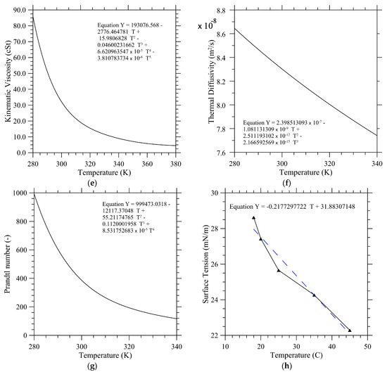 Physical Properties of Emkarate RL22H as a function of temperature as provided by the manufacturer: (a) Dynamic viscosity μ (exp. measurements); (b) Density ρ (exp. measurements); (c) Specific Heat at constant pressure Cp (exp. measurements); (d) Thermal conductivity λ (exp. measurements); (e) Kinematic viscosity ν (derived quantity, ν = μ/ρ, 1 cSt = 10−6 m2/s); (f) Thermal diffusivity α (derived quantity, α = λ/ρCp); (g) Prandtl number (derived quantity, Pr = ν/α), (h) Surface tension σ.