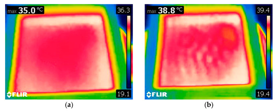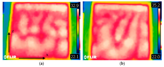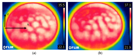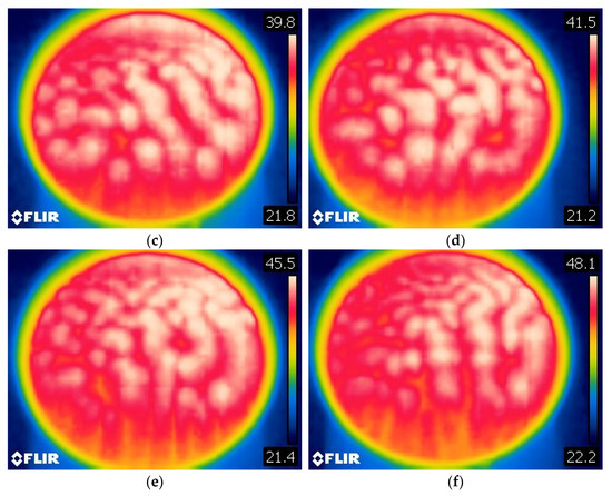 In line with other successful attempts in the literature (see, e.g., Cerisier et al. [37,38]; Ismagilov et al. [39]; Chauvet et al. [40]; Wang et al. [41]; Wu et al. [42]; Sobac et al. [43]; Tönsmann et al. [44]), the distribution of temperature on the free surface of the considered liquid is observed using a FLIR C3-X Compact Thermal Imaging Camera (the related IR sensor has a resolution of 128 × 96 px and thermal sensitivity of 70 mK; moreover, it can detect and measure temperatures between −20 °C and +300 °C to an accuracy of ±3%).