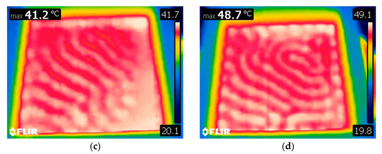 Surface temperature distribution for d = 0.75 cm (Ω = 48 mL) (A = 10.6, Bodyn ≅ 1.94, Ra ≅ 8.6 × 102 × ΔT, Ma ≅ 4.4 × 102 × ΔT): (a) ΔT = 15 °C, (b) ΔT = 21 °C, (c) ΔT = 27 °C, (d) ΔT = 33 °C.