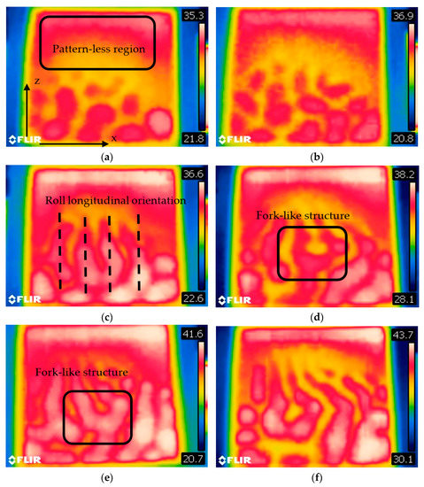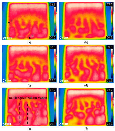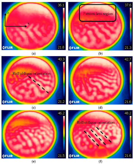 Superimposed on these trends, most interestingly, in some cases, in place of the striped pattern, which one would expect in the ideal situations of parallel longitudinal rolls, tree-like shapes can be distinguished in the surface temperature distribution. These give an external observed the illusion of a roll with a fork-like structure (two strips originating from a single initial strip, see the black rectangle in Figure 6d,e).