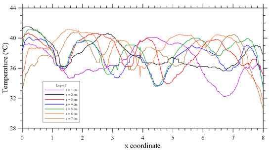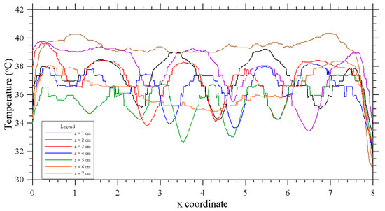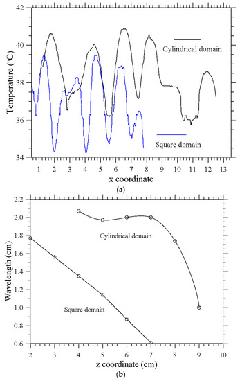 Notably, although these may immediately be classified as ‘longitudinal rolls’ (their axes being parallel to the tilt direction), their specific spatial configuration bares characteristic ingredients, which also need to be pinpointed suitably here. Their cross-extension, i.e., the typical size in a direction perpendicular to the roll axis undergoes remarkable variations along the z (tilt) direction, which indicates that the dimensional wavelength is not constant in the physical domain. Here, this quantity is defined as the distance between two consecutive corresponding crests or “points of the same phase” along the x axis for a fixed value of z. The related behaviors are quantitatively substantiated in Figure 7, where the wavelength has been plotted as a function of the z coordinate for a representative ΔT. Interestingly, as the ΔT is increased, some other interesting changes show up. The length of the rolls along the z direction grows (compare, e.g., Figure 6a,f, the reader being also referred to the data reported in Figure 8).