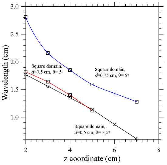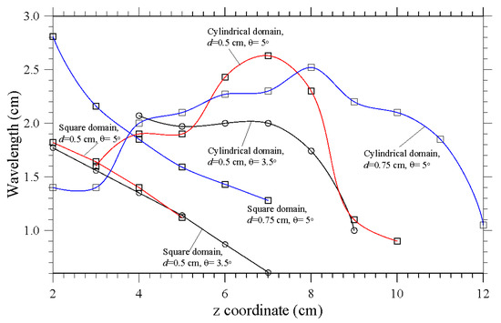 In the cylindrical case, for d = 0.5 cm (Bodyn ≅ 0.86) and ϑ ≅ 5° the wavelength curve is entirely located above the corresponding one for the square domain (refer to the red branches in Figure 19). The cylindrical case, however, displays a maximum for z = 7 cm, followed by a branch of decreasing behavior. Notably, an interval of the z coordinate can be identified accordingly where the wavelength for ϑ ≅ 5° is smaller than that attained for the same average liquid depth (d = 0.5 cm) and ϑ ≅ 3.5° (z < 5.2 cm). The same concept applies to the curve for d = 0.75 cm (Bodyn ≅ 1.94) and ϑ ≅ 5°. Although, the wavelength is larger than the corresponding one for d = 0.5 cm over almost the entire longitudinal extension of the fluid domain, this relationship is inverted in the range 5.7 < z < 7.7 cm. This curve even intersects the corresponding one for the square container for z ≅ 3.8 cm (refer to the blue branches in Figure 19), which indicates that circumstances exist where the wavelength in the cylindrical case can become smaller than the equivalent square-domain value (Bodyn ≅ 1.94, ϑ ≅ 5° and z < 3.8 cm).