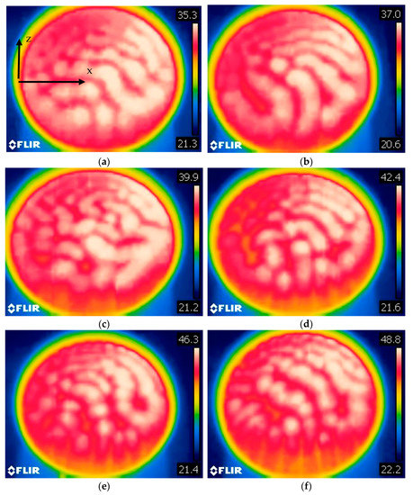 Surface temperature distribution for d = 0.50 cm (Ω ≅ 70 mL) and ϑ ≅ 5° (A = 26.6, Bodyn ≅ 0.86, Ra ≅ 2.5 × 102 × ΔT, Ma ≅ 2.94 × 102 × ΔT): (a) ΔT = 15 °C, (b) ΔT = 18 °C, (c) ΔT = 21 °C, (d) ΔT = 24 °C, (e) ΔT = 27 °C, (f) ΔT = 30 °C (the x and z axes correspond to the horizontal and vertical directions in all the panels).