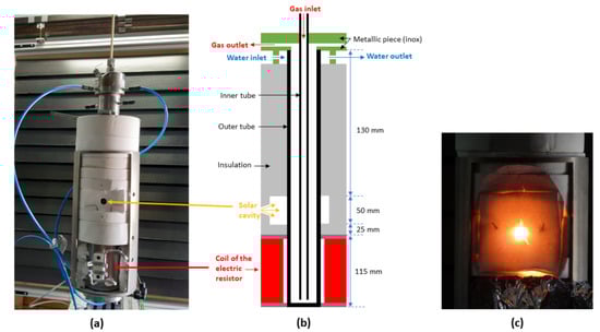 Figure 1a,b shows the hybrid reactor configuration. Two coaxial tubes, the outermost being closed at one end, are centered in an insulated circular layer to reduce conductive heat losses to the environment. The tubes are made of alumina (Al2O3) to allow operation at high temperatures (1273–1673 K). Heating is possible using either a solar cavity receiver or an electric heater located a few centimeters below the cavity, or even using both heating modes when DNI is not high enough for a fully on-sun operation. The height of the electric heater set at the bottom of the reactor is 115 mm. The maximal power of the heater is 400 W, which is high enough to reach temperatures in the range of 1273–1673 K. Then, a 25 mm-thick insulation layer is set between the electric heater and the solar cavity. The height of this cavity is 50 mm, with an aperture of 15 mm (Figure 1) for concentrated solar radiation entrance. The cavity absorbs the concentrated solar flux received from a 1.5 kW (thermal) heliostat-parabola solar system (2 m diameter parabolic dish with a peak concentration ratio of about 10,000).
