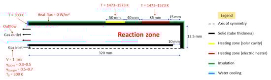 The model geometry of the hybrid reactor described in Figure 1 was developed and designed to provide a fast-enough convergence of the Fluent solver. Only the tubular reaction zone was simulated. In particular, the solar cavity receiver and the electric heater were not implemented. In place, the wall temperature was set as a boundary condition. Constant wall temperature was chosen as a first approach because homogeneous temperatures are expected when reaching thermal equilibrium, both in the solar cavity (black-body behavior, heated length corresponding to the cavity height: 50 mm) and in the electric heater (uniform heating along the coil, the effective heated length of the electric resistance was assumed to be 85 mm).
