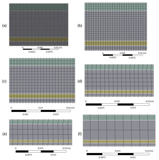 Quadrilateral meshing sizes for the study of independency on meshing: (a) mesh size = 0.2 mm; (b) mesh size = 0.6 mm; (c) mesh size = 1 mm; (d) mesh size = 2 mm; (e) mesh size = 3 mm; (f) mesh size = 4 mm.